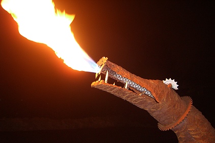 Ein Mythos, ein Wesen, neu geschaffen von Menschen aus der Jetztzeit — Feuerspeiendes wurde für Fantasiereisende zum Leben erweckt. Eine mobile oder immobile Eventfackel — ein Beispiel für die Machbarkeit an Form, Design, Material und Technik.